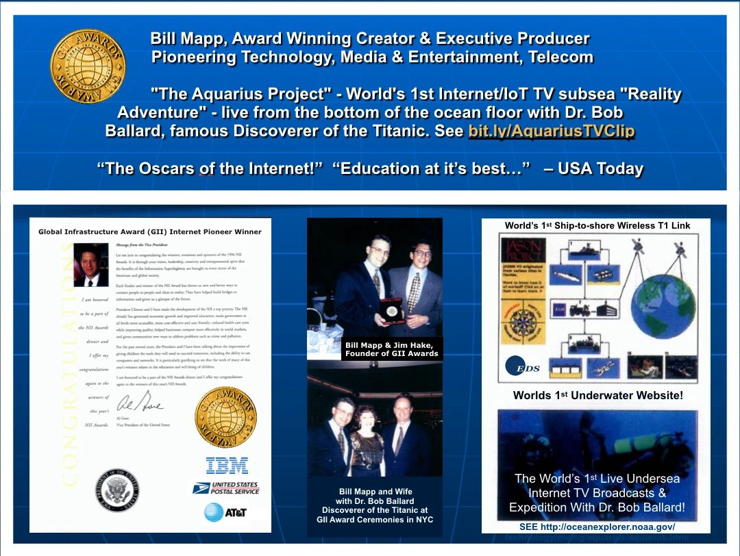 Pioneering technology innovations recognition in IoT, AI, Robotics, VR, Video, media, wireless microwave, and satellite communications includes Internet Pioneer award (“The Oscars of the Internet!” - USA Today) by IBM, AT&T, SRI Consulting, Price Waterhouse, Academy of Television Arts & Sciences, American Film Institute (AFI) and 70 others. Awards and achievements include being the first to connect our planet's ocean to the Internet, (i.e., "Subsea IoT) for "The Aquarius Project" (See Aquarius pic above) that Bill conceived/ produced for The Jason Project, for Dr. Robert Ballard, famous oceanographer and discoverer of the RMS Titanic that sank in the North Atlantic Ocean in 1912.